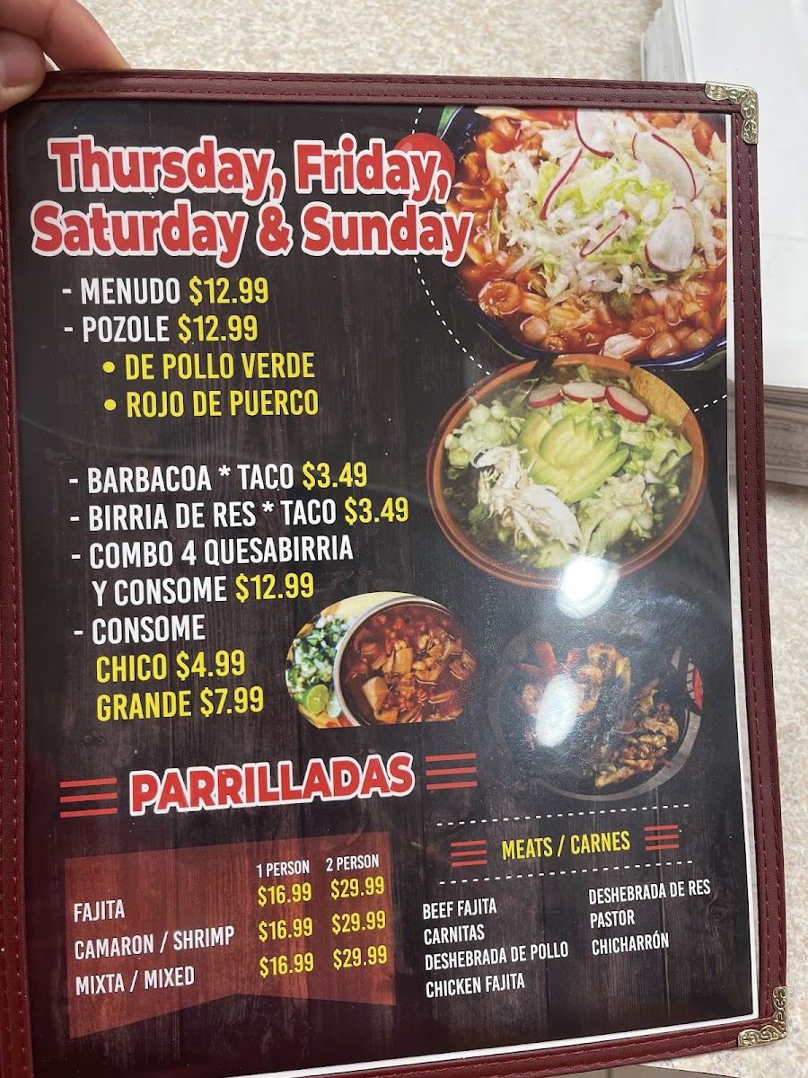 Served with two portion of meats, beans, rice, pico de Gallo & 3 tortillas.
